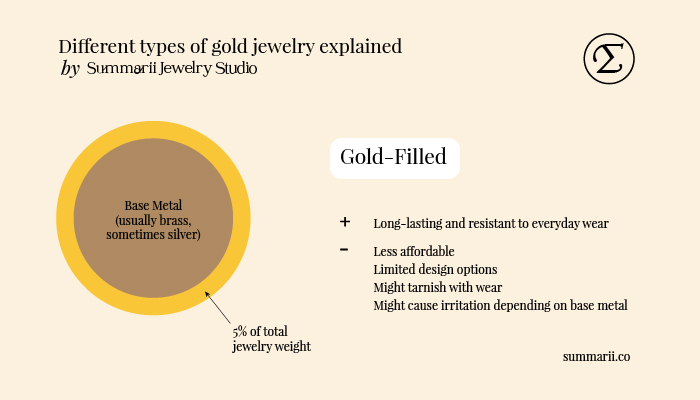 Gold-filled jewelry has a mechanically bonded thick layer of gold (usually 5% by weight) over a base metal usually brass or copper. It's generally considered to be hypoallergenic, but people with sensitive skin may still experience irritation due to its base metal not being hypoallergenic.