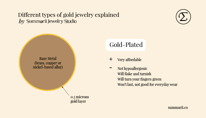 Gold-plated jewelry is usually sold in the fast fashion industry as it’s very affordable and only lasts for weeks or months with regular wear. It’s also very prone to fading, flaking, scratching, and tarnishing—it’ll probably also discolor and turn your skin green. It’s not hypoallergenic as it may cause skin irritation, especially for sensitive skins.